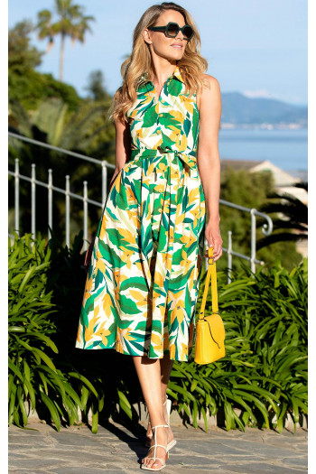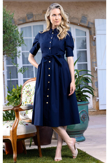 Stylish dress in luxurious viscose with paisley motifs in blue on an ecru base. The midi length model features a flared skirt with pockets, 3/4 sleeves and a classic collar, button fastening and a belt to accentuate the waist for a more elegant look. Print placement may vary depending on size.