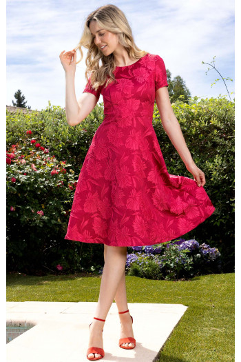 Elegant straight formal dress made of satin jacquard in Bronze Medal color with black floral motifs. The model features short sleeves, a knee-length cut, and a concealed back zipper closure. The structured fabric with slight elasticity enhances the body’s curves, while the satin sheen adds sophistication and style. This jacquard dress is the perfect choice for special occasions and is sure to become a standout piece in your formal wardrobe.