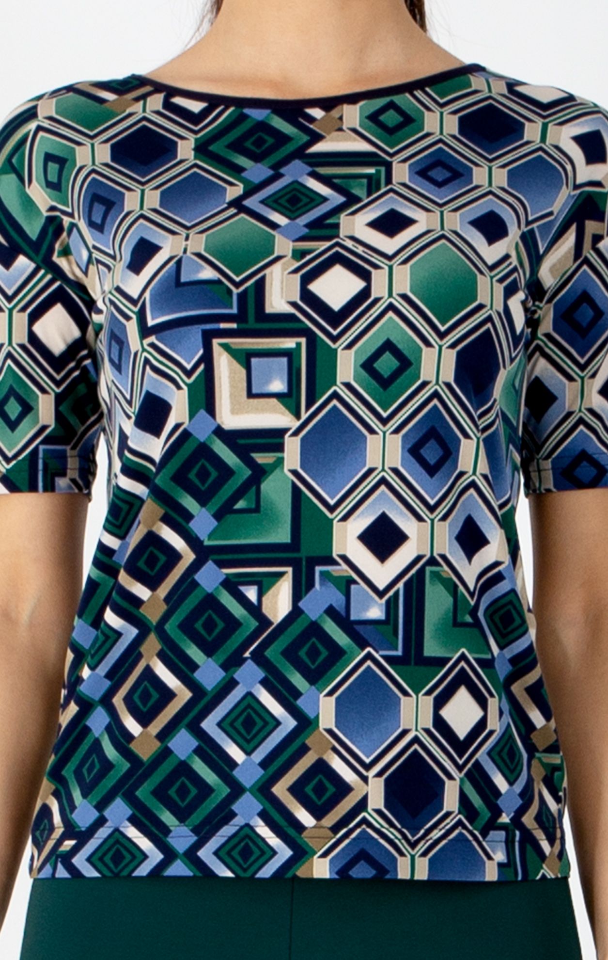 Blouse with a relaxed silhouette, designed in a geometric print in shades of Palace Blue and Turquoise, adding structure and dynamism to the look and making the piece a standout element of the outfit. The model features a loose upper part that tapers slightly toward the hem, short sleeves with dropped shoulders, and a boat neckline that delicately highlights the neck and shoulders. A comfortable blouse made from stretchy jersey knit, perfect for everyday wear and the office.