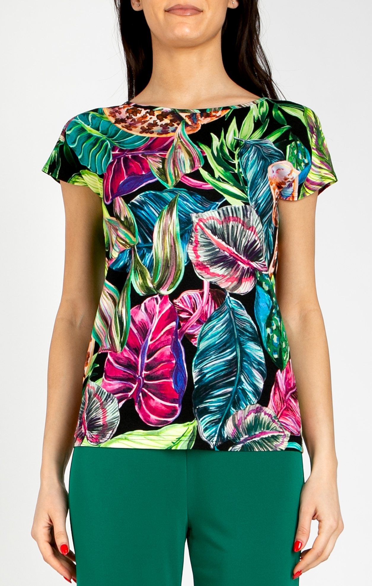 Blouse with vibrant floral motifs in Fuchsia, Turquoise, and Green. A lightweight knit blouse featuring a bold leaf print in rich pink, turquoise, and green on a black base. The model has a relaxed silhouette with short dropped sleeves and a boat neckline, making it suitable for all body types. Add a dynamic and exotic touch to your wardrobe with this eye-catching piece from Daphne. The combination of vivid colors and a classic black base makes it a perfect accent for a modern urban look.