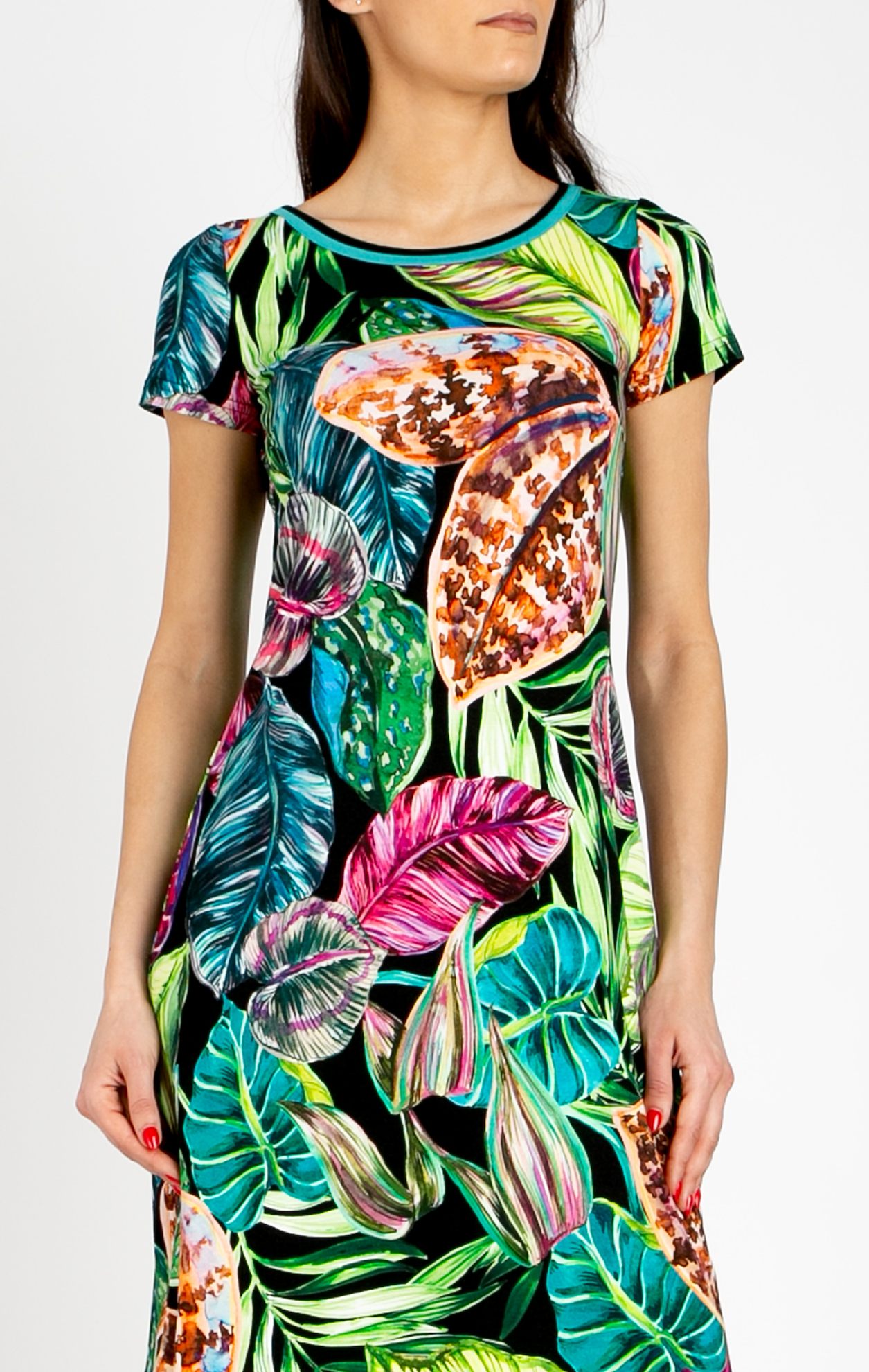 Comfortable knit dress with vibrant floral motifs in Fuchsia, Turquoise, and Green. The model features short sleeves, a boat neckline finished with a two-tone trim, a classic knee-length cut, and a teardrop opening at the back. The loose silhouette ensures comfort and ease of movement, making it suitable for all body types. This dress is a stylish choice for women who want to look polished while feeling free throughout the day. Available in sizes 36 to 46.