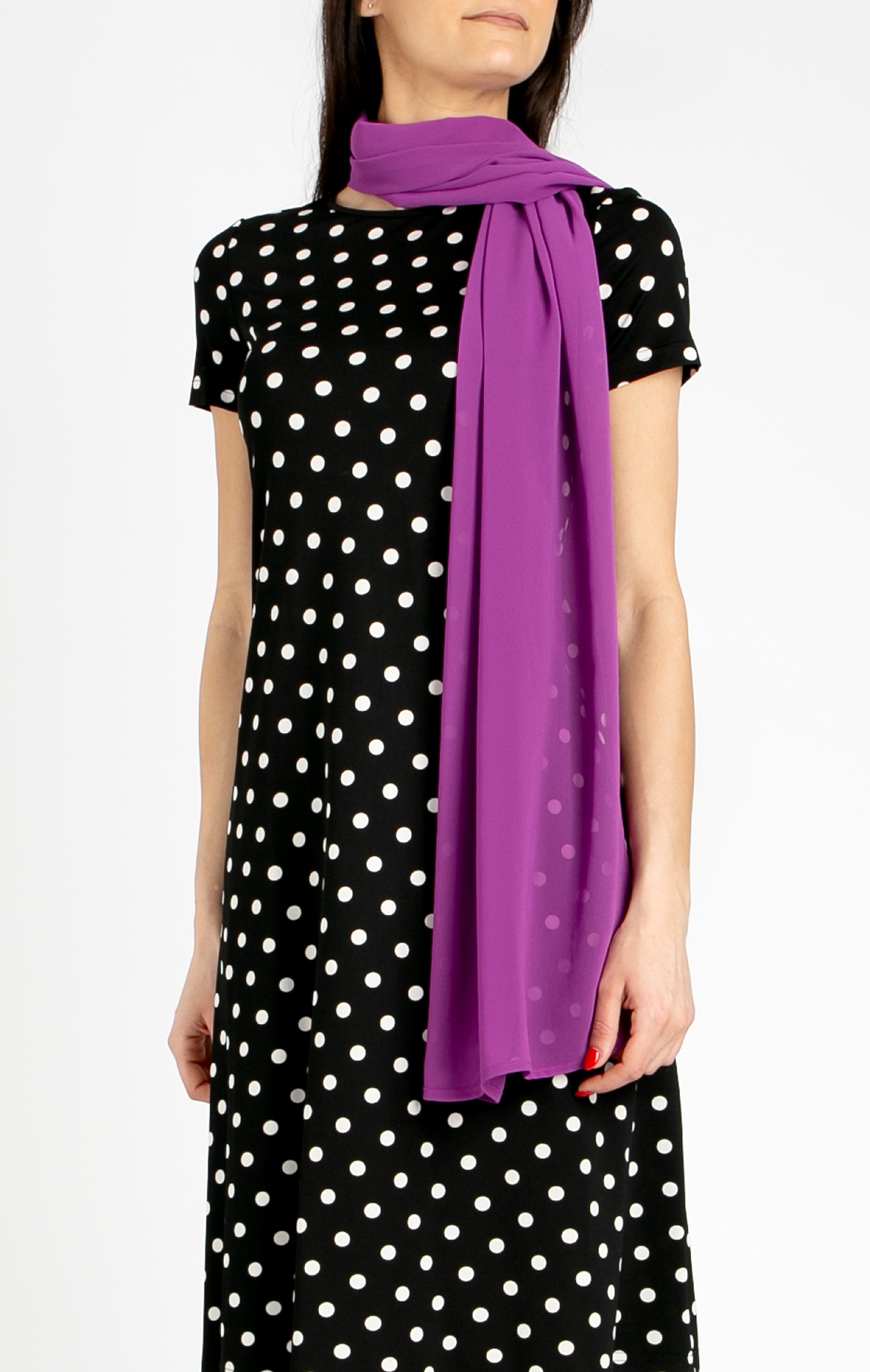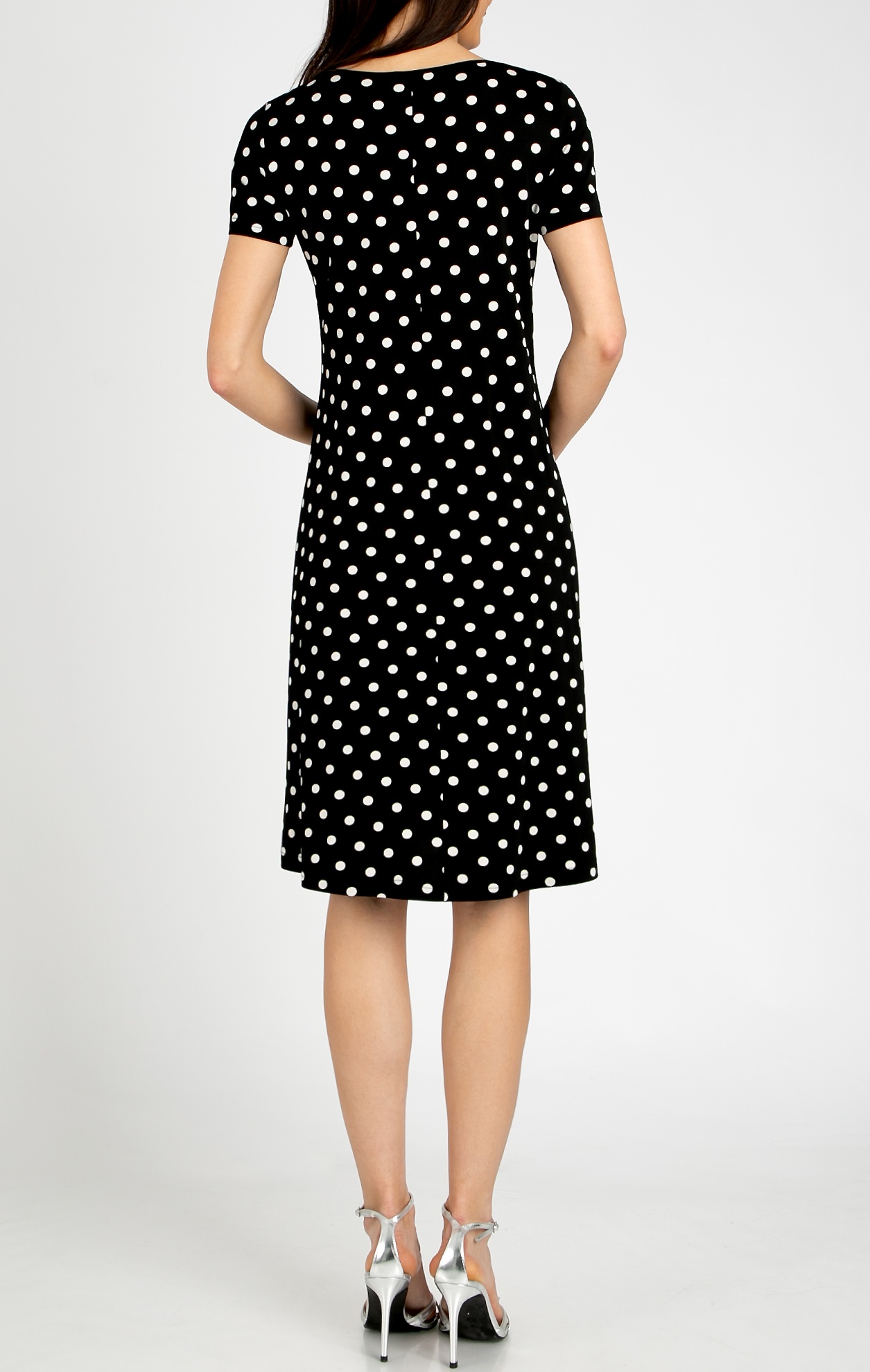 Elegant dress made from luxurious black jersey with a “Polka Dots” pattern. The design features a round neckline, short sleeves, and a knee-length A-line silhouette that drapes naturally over the body, providing comfort and freedom of movement. This versatile dress is perfect for everyday wear, elegant evening occasions, or stylish daytime events.
