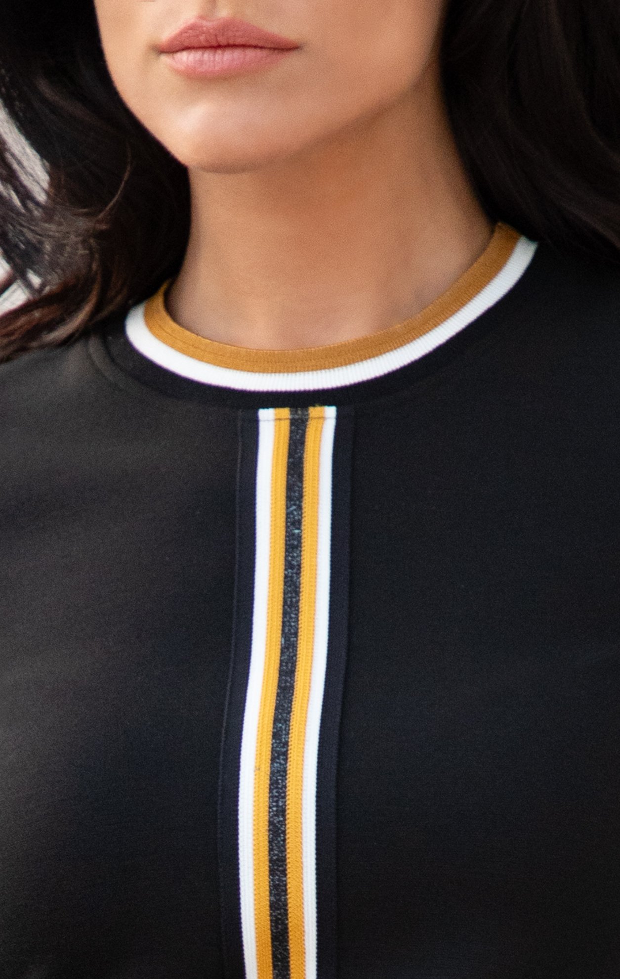 Elegant black blouse in stretch knit with decorative white and mustard stripe