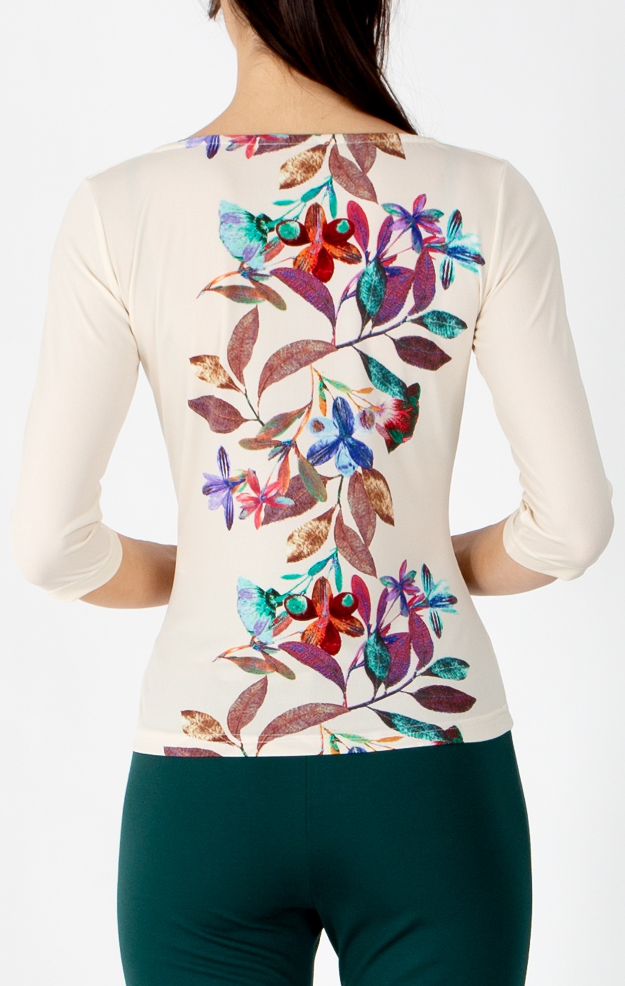 Stylish blouse with a draped neckline in Vanilla Ice, featuring a vertical floral border that visually elongates the silhouette. The model has a fitted cut, 3/4 sleeves, and an elegantly draped neckline that beautifully highlights the neck, made from stretchy jersey-type knit. A versatile piece that pairs easily with blazers, cardigans, or trousers—an ideal choice for a contemporary urban look.