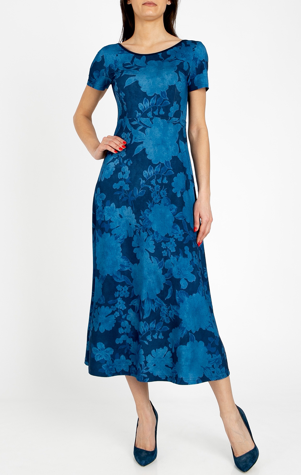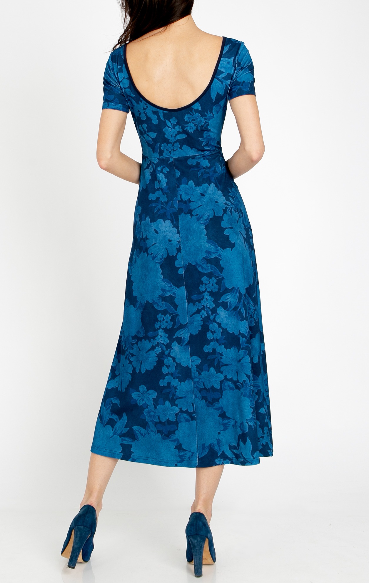 This elegant dress combines the comfort of soft knit fabric with an artistic design. The model features a gently fitted bodice that flows into a flared silhouette, providing ease of movement. It has short sleeves, a boat neckline, and a deeply cut back that adds a surprising and feminine accent. The striking floral print on a dark blue base creates a sense of depth and style.
