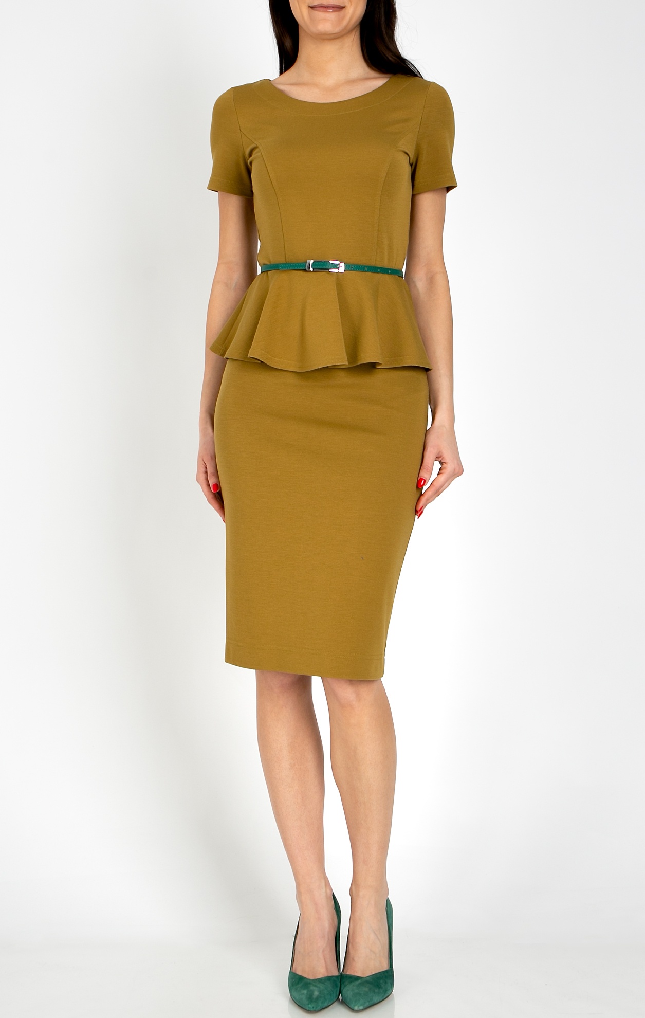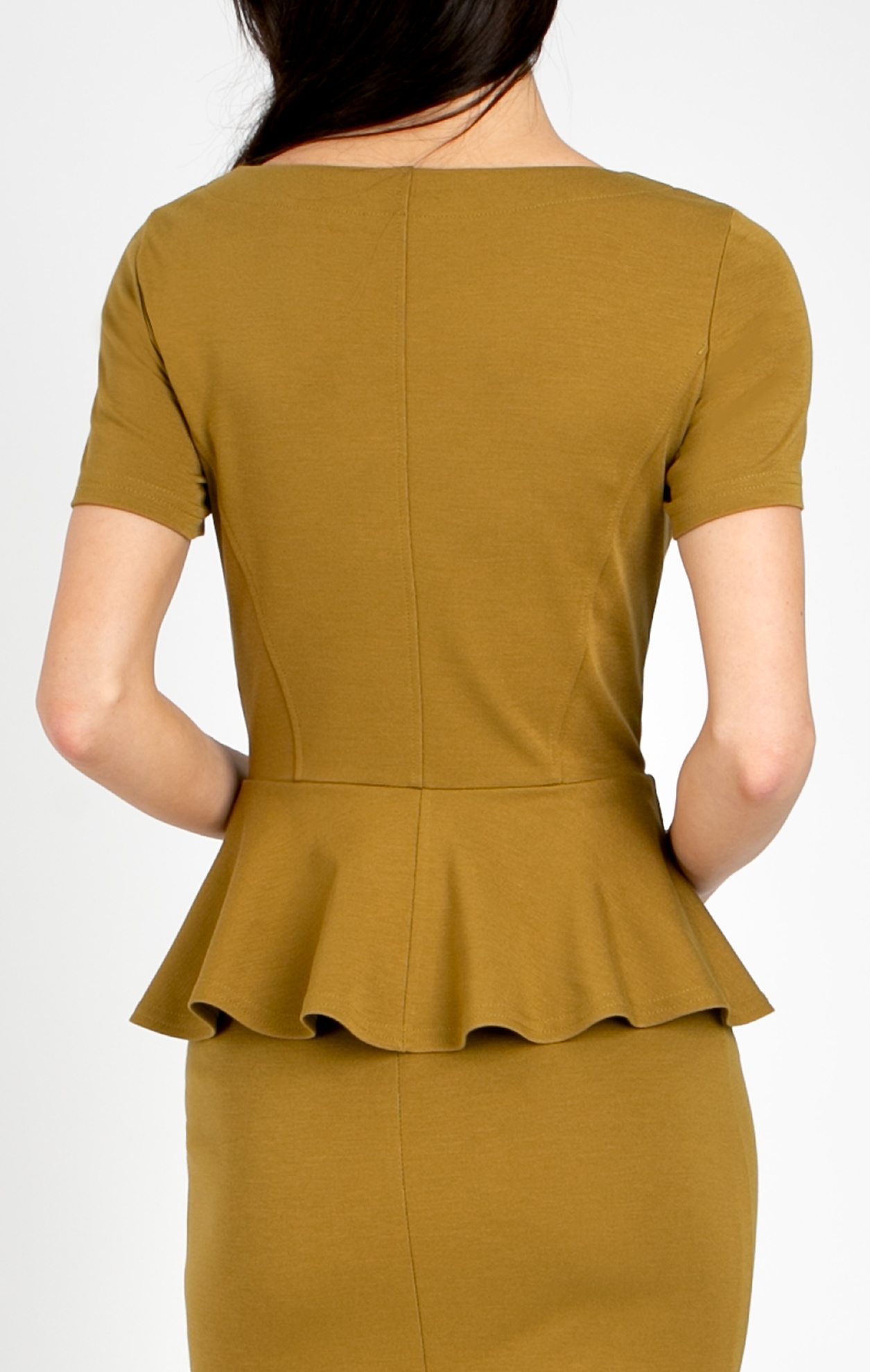 Elegant peplum blouse with short sleeves, made from structured knit fabric in Bronze Mist. This refined blouse combines a modern look with classic sophistication. Crafted from high-quality structured knit, it features a fitted silhouette and a striking peplum waist that creates harmonious and feminine proportions. The contemporary shade highlights your individuality, while the closed round neckline and short sleeves make it an ideal choice for a business wardrobe. Pair it with a skirt in the same color to create a complete outfit and accentuate the waist with a leather belt from the Daphne collection. Suitable for both office wear and elegant everyday occasions.
