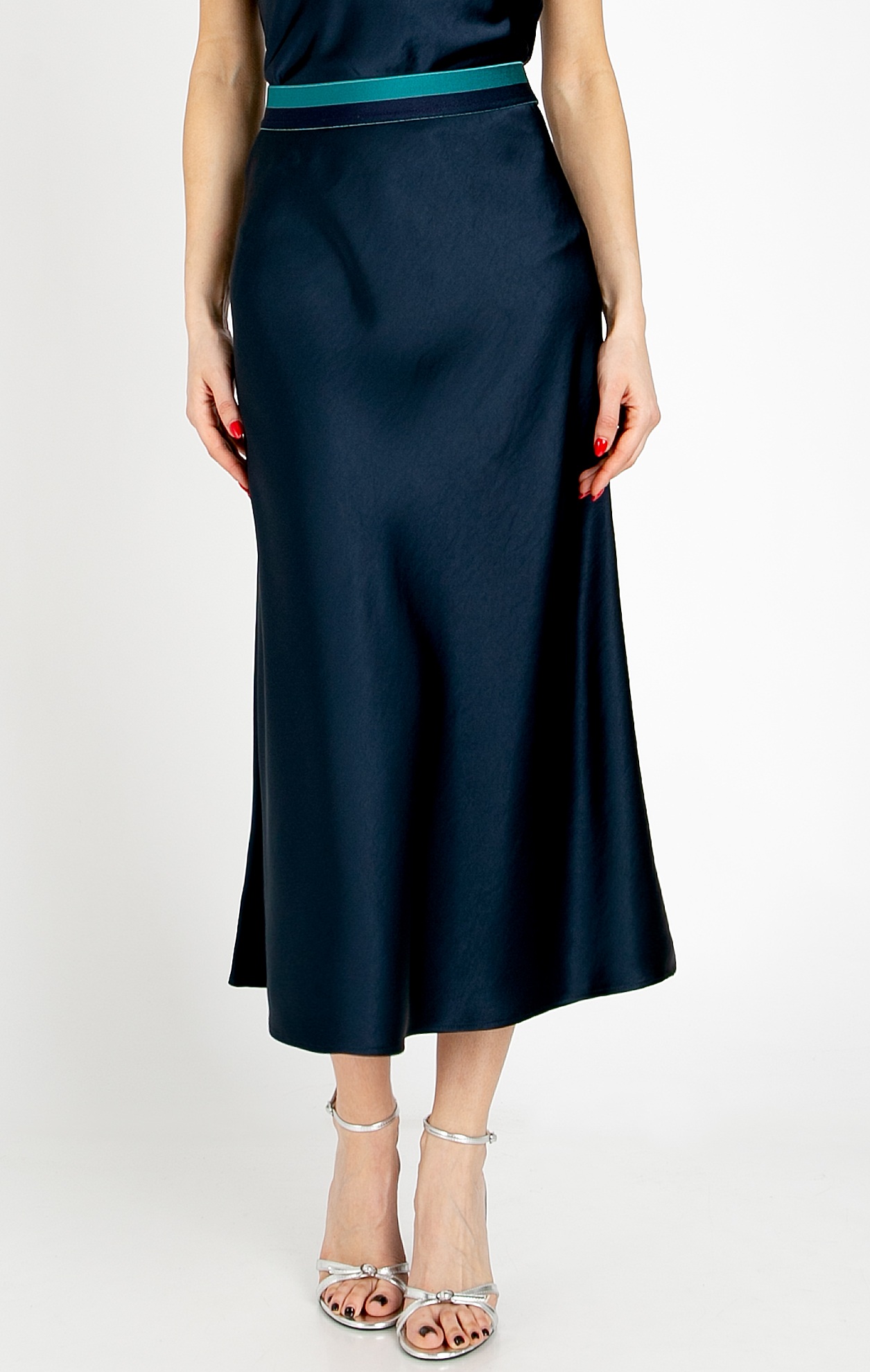 Elegant midi skirt in dense satin in Evening Blue. The smooth, heavily draping fabric creates a luxurious feel, while the delicate satin sheen highlights the beauty of every movement. The multicolored decorative waistband adds a stylish and luxurious accent, as well as extra comfort. The skirt is a perfect choice for special occasions or for adding elegance to everyday wear.
