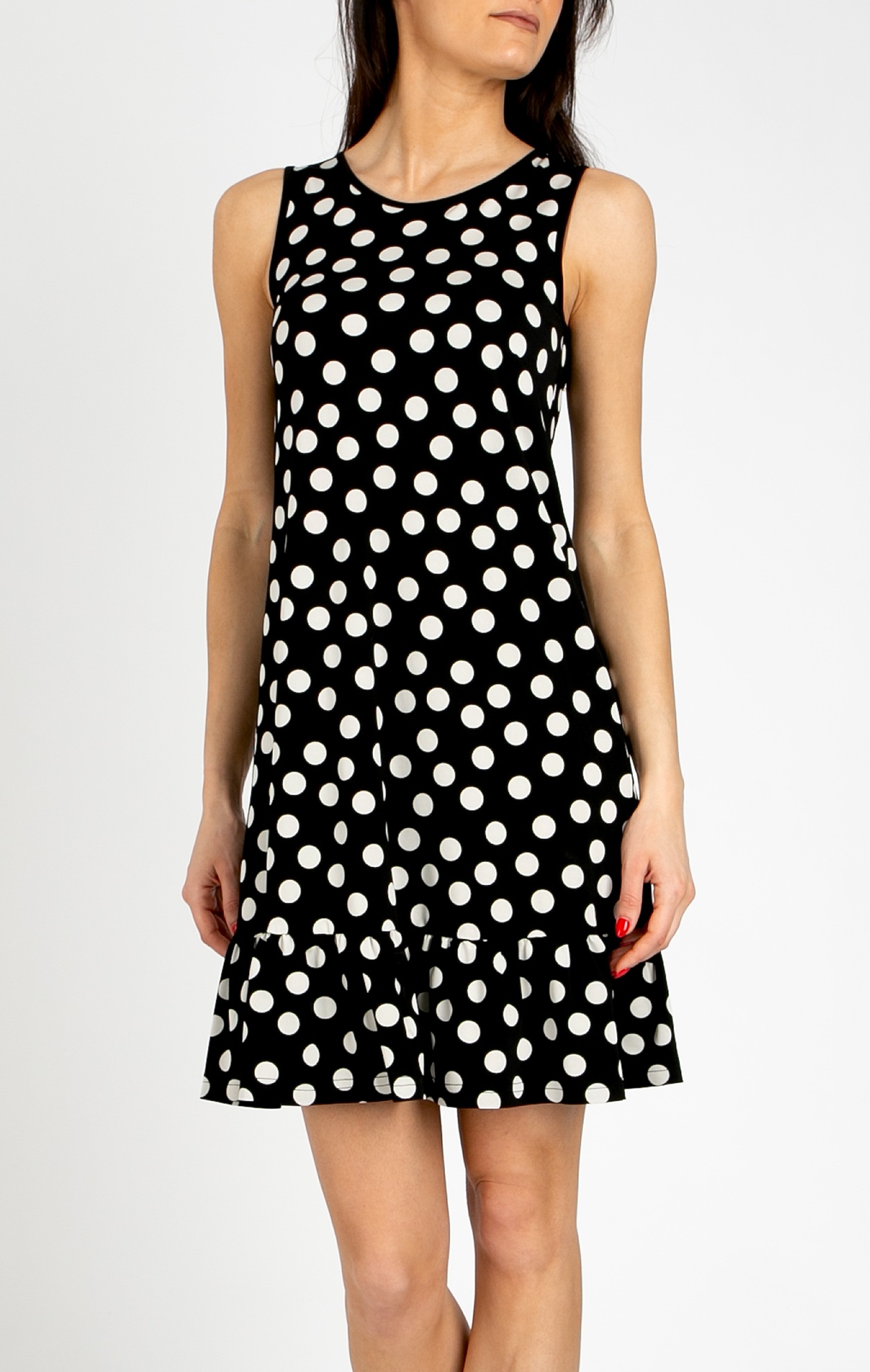 Enjoy comfort and style on warm days with this elegant summer dress crafted from luxurious viscose jersey in Black with a “Polka Dots” pattern. The smooth knit fabric gently drapes the body, keeping you cool throughout the day. The design features a feminine round neckline, a keyhole opening at the back, and a delicate hem ruffle that adds movement and lightness to the silhouette. Perfect for everyday wear or casual summer gatherings, this dress combines ease, sophistication, and airy elegance in one look.
