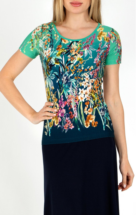 Fitted blouse, crafted from soft and stretchy tricot. The model is graphic-printed with round neckline and 3/4 sleeves. The position of prints may vary depending on size or pattern.