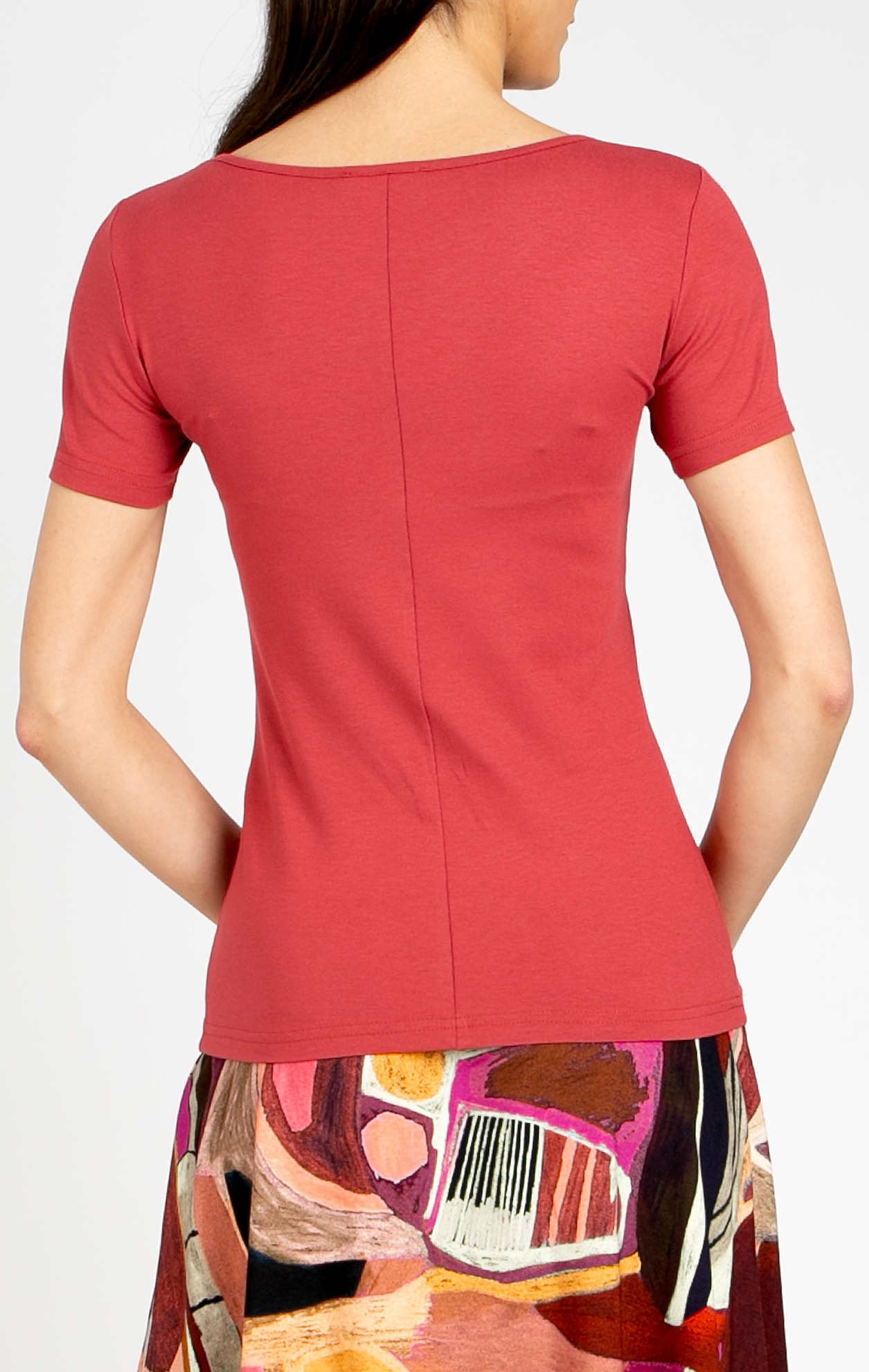 Fitted short-sleeve blouse in Cranberry. The model features an open round neckline finished with trim, short sleeves, and a small heart-shaped metal logo. Made from soft knit fabric, it gently follows the body’s shape. A comfortable piece suitable for both everyday wear and the office, легко paired with various skirts and trousers.