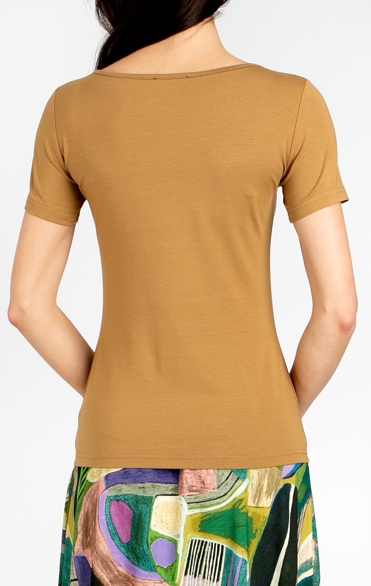 Fitted blouse in Medal Bronze. The model features a round neckline finished with trim and short sleeves. Made from soft knit fabric, it gently follows the body, providing comfort throughout the day. Easy to pair with skirts, trousers, or denim for versatile styling.