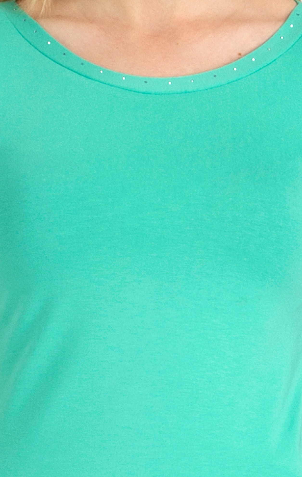 Fitted top of stretch viscose jersey in Aqua Green color. Short sleeves and Swarovski crystals around the neckline.