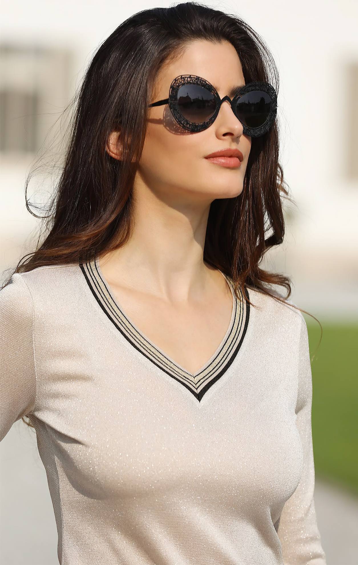Fitted blouse with a V-neckline in light beige with a silver shimmer. The V-neckline beautifully accentuates the neckline, while the exquisite knit fabric captivates with its delicate shine. This blouse pairs elegantly with both trousers and skirts, making it a great choice for everyday wear and special occasions such as dinners and festive events.