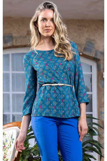 Flared formal dress in satin jacquard in Blue Sapphire with beautiful floral motifs