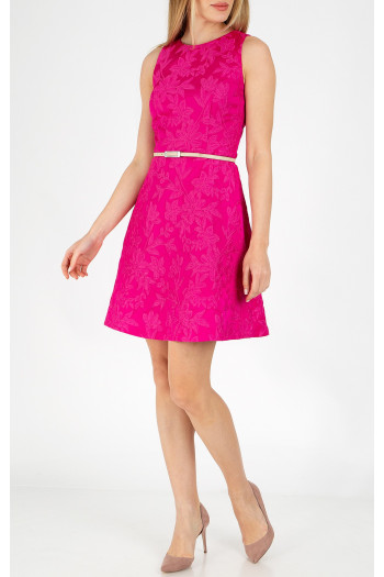 Elegant flared dress in satin jacquard in Raspberry Wine with beautiful floral motifs