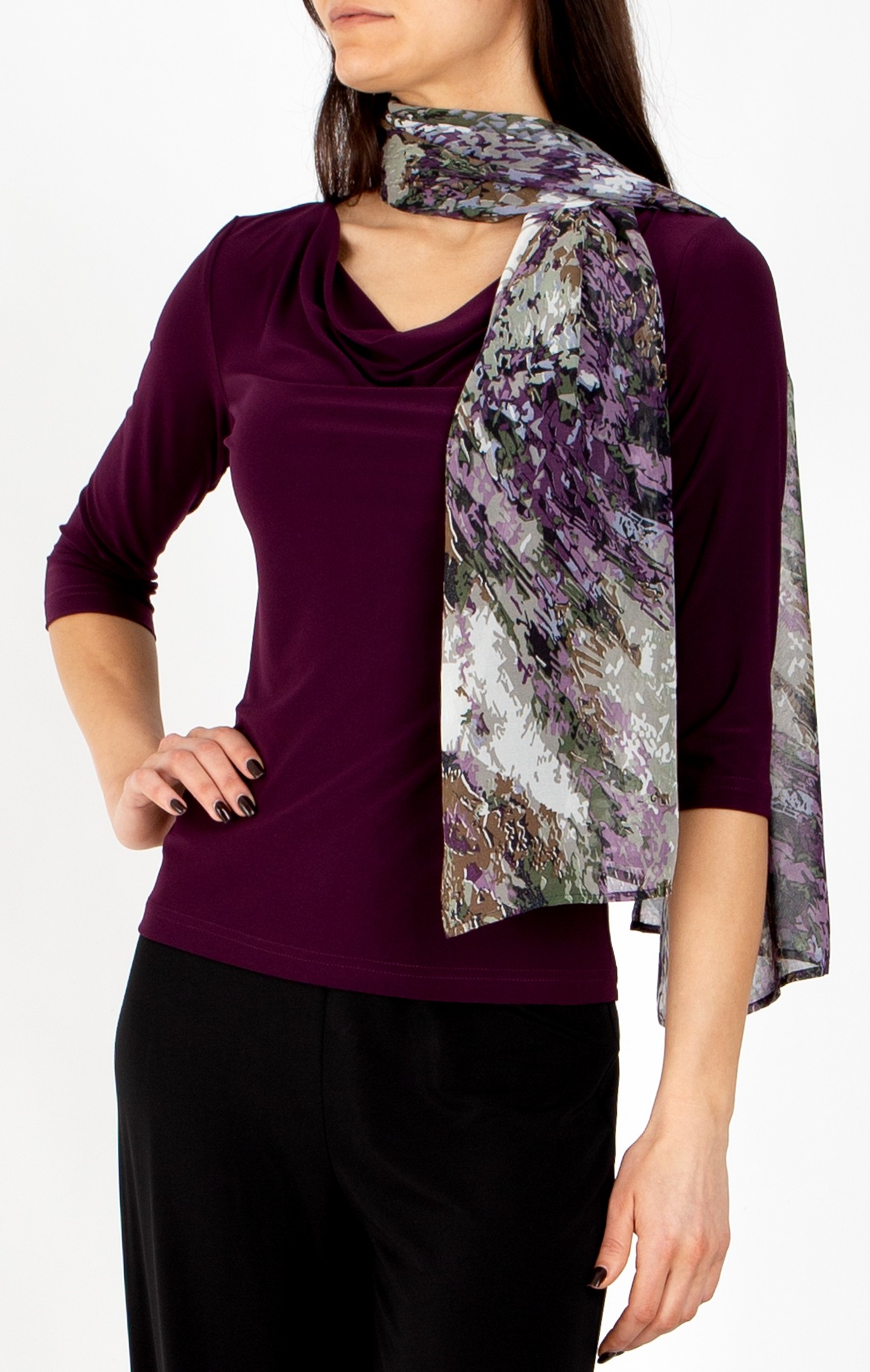 Add the perfect finishing touch to your look with this elegant, airy scarf. Made from high-quality fabric, it is lightweight and delicate. The scarf features an abstract pattern in shades of purple and green – ideal for pairing with both casual and formal outfits. Its length allows for easy draping around the neck, adding style and elegance to any ensemble.