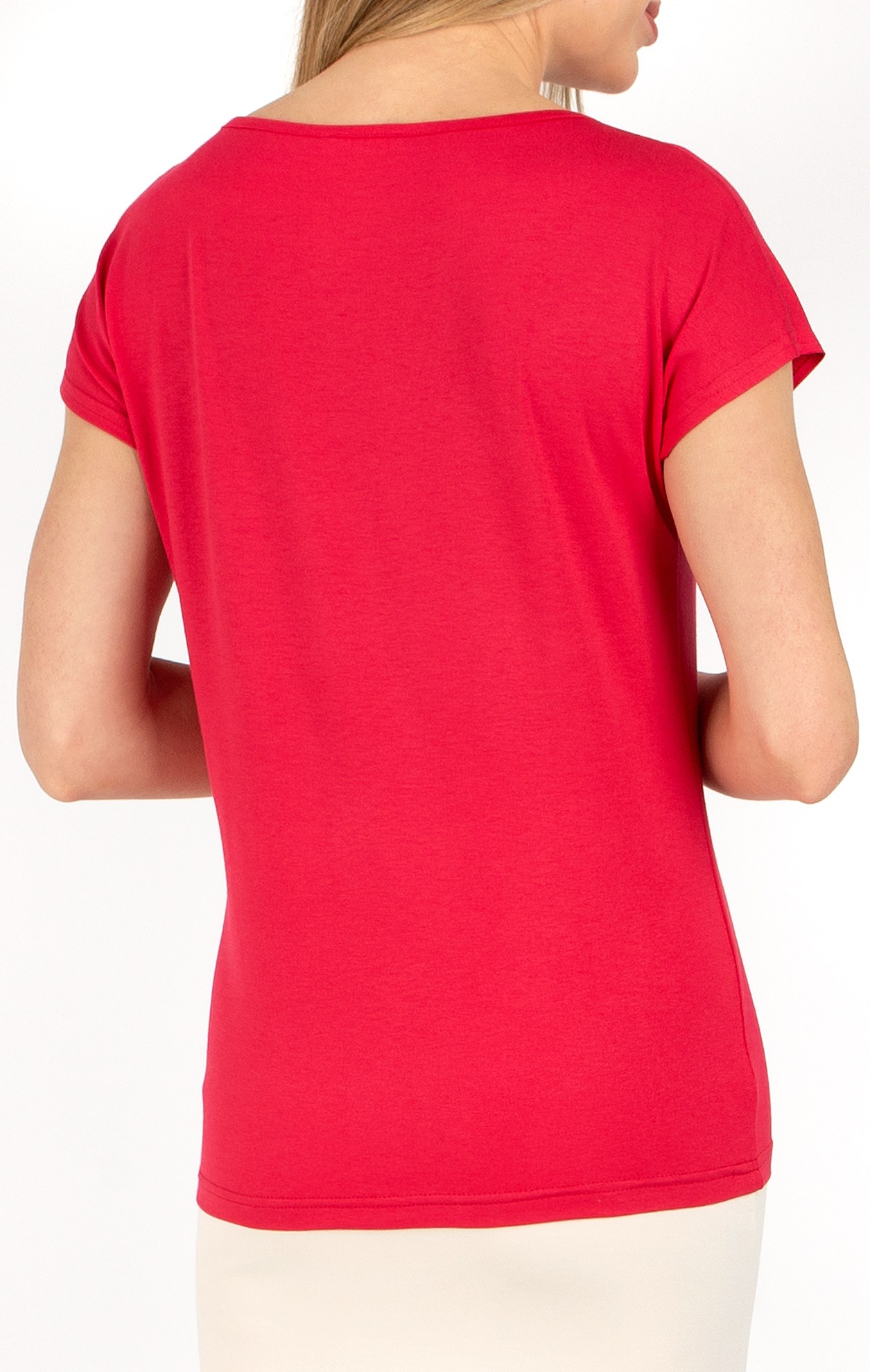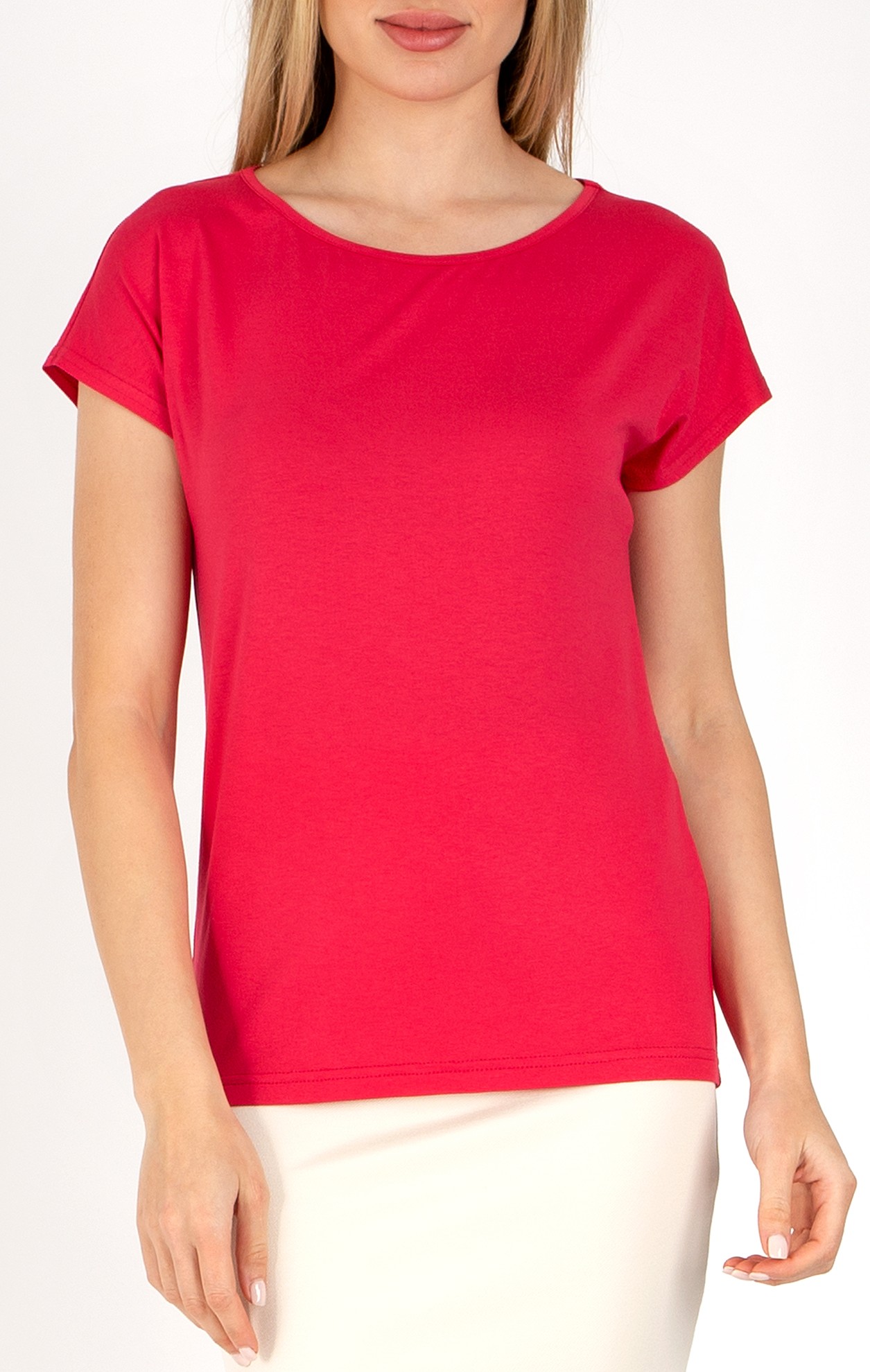 Sporty-chic blouse with a loose silhouette, dropped shoulders and boat neckline. Made from luxurious jersey in Raspberry Wine, with a neckline with edging in the same colour. Suitable for any style, this floral blouse will brighten up your summer wardrobe.