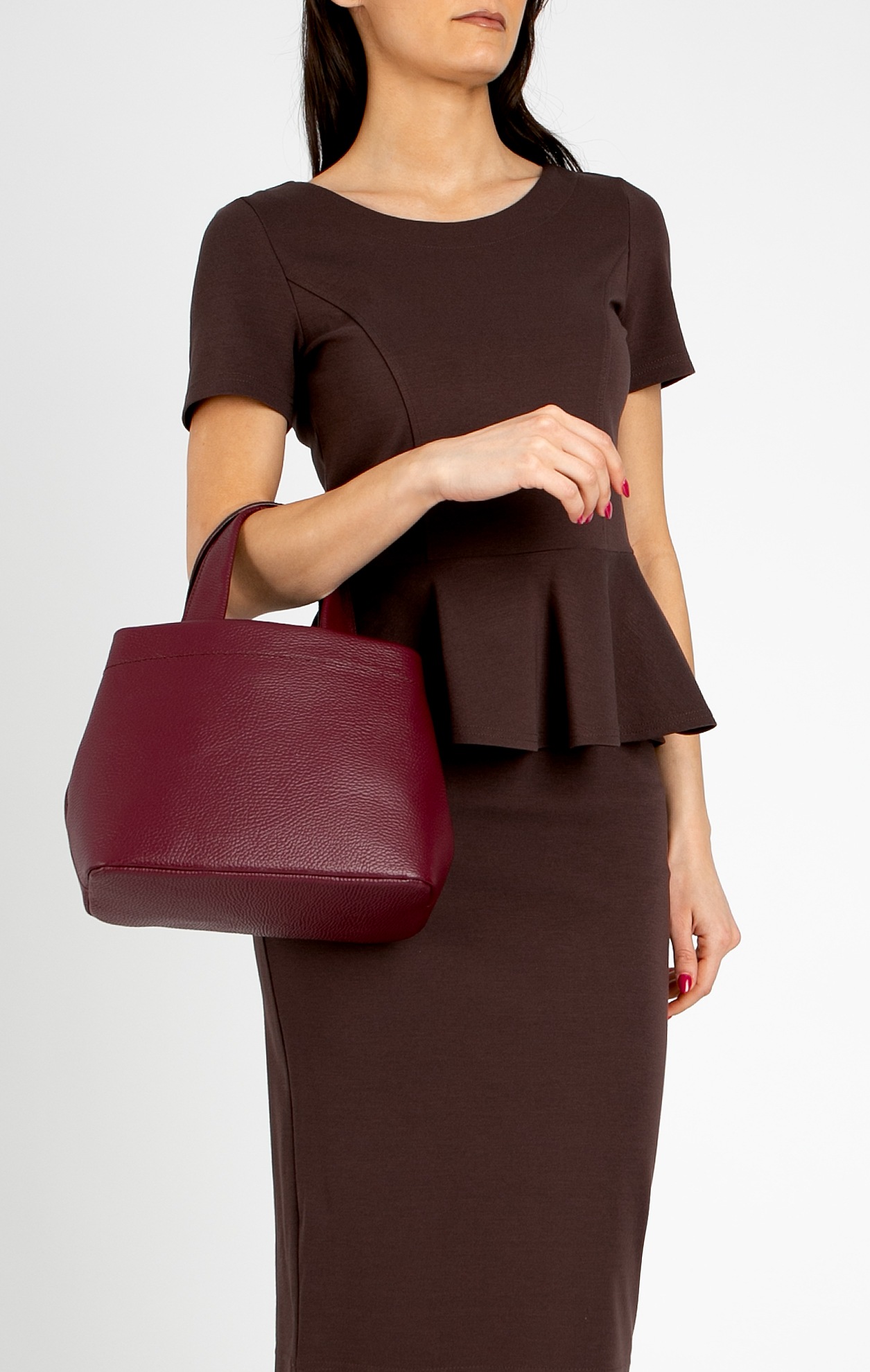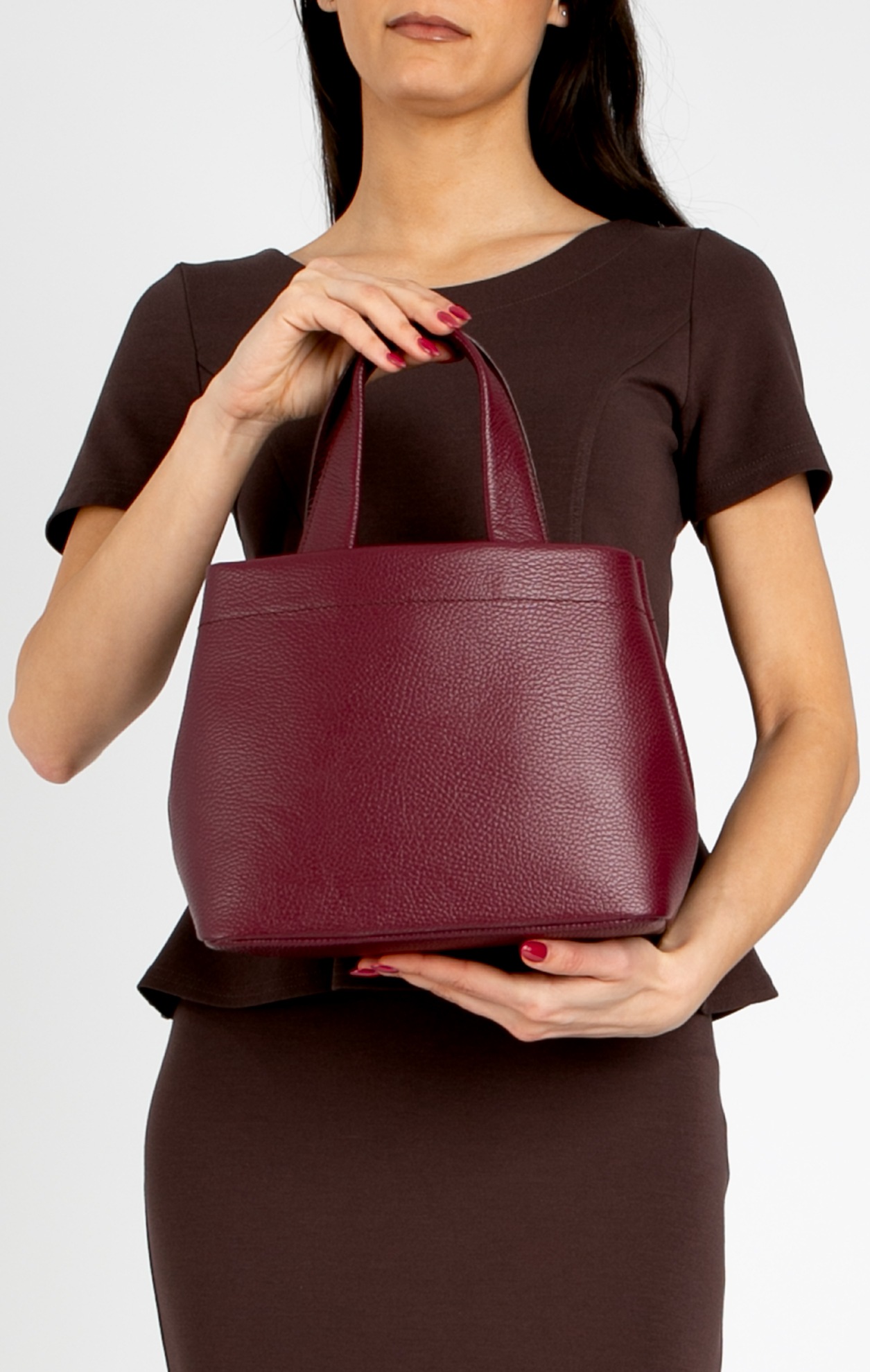 Genuine leather bag in Wine Red color, featuring one main compartment with two small inner pockets – one with a zipper and another suitable for storing a phone. The bag closes with a zipper, and the sides can be expanded or adjusted with snap buttons. Details: