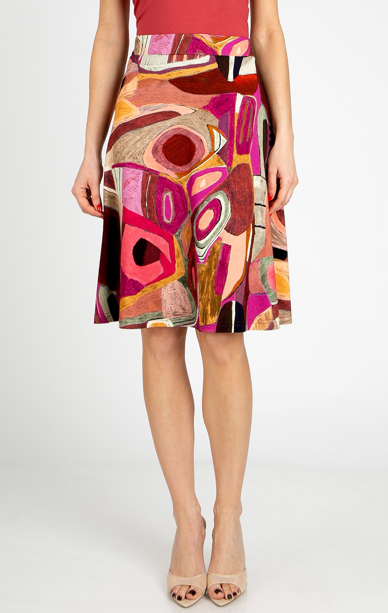 Short flared skirt made of lightweight knit fabric in an abstract graphic print in Brick and Fuchsia. The skirt falls around the knee, features an elastic waistband, and is unlined. Its relaxed silhouette provides comfort and ease, while the colorful dynamic print adds a summery, cheerful touch. Pair it with a solid-color top for an everyday urban look or with a blouse in the same print for a striking coordinated outfit.