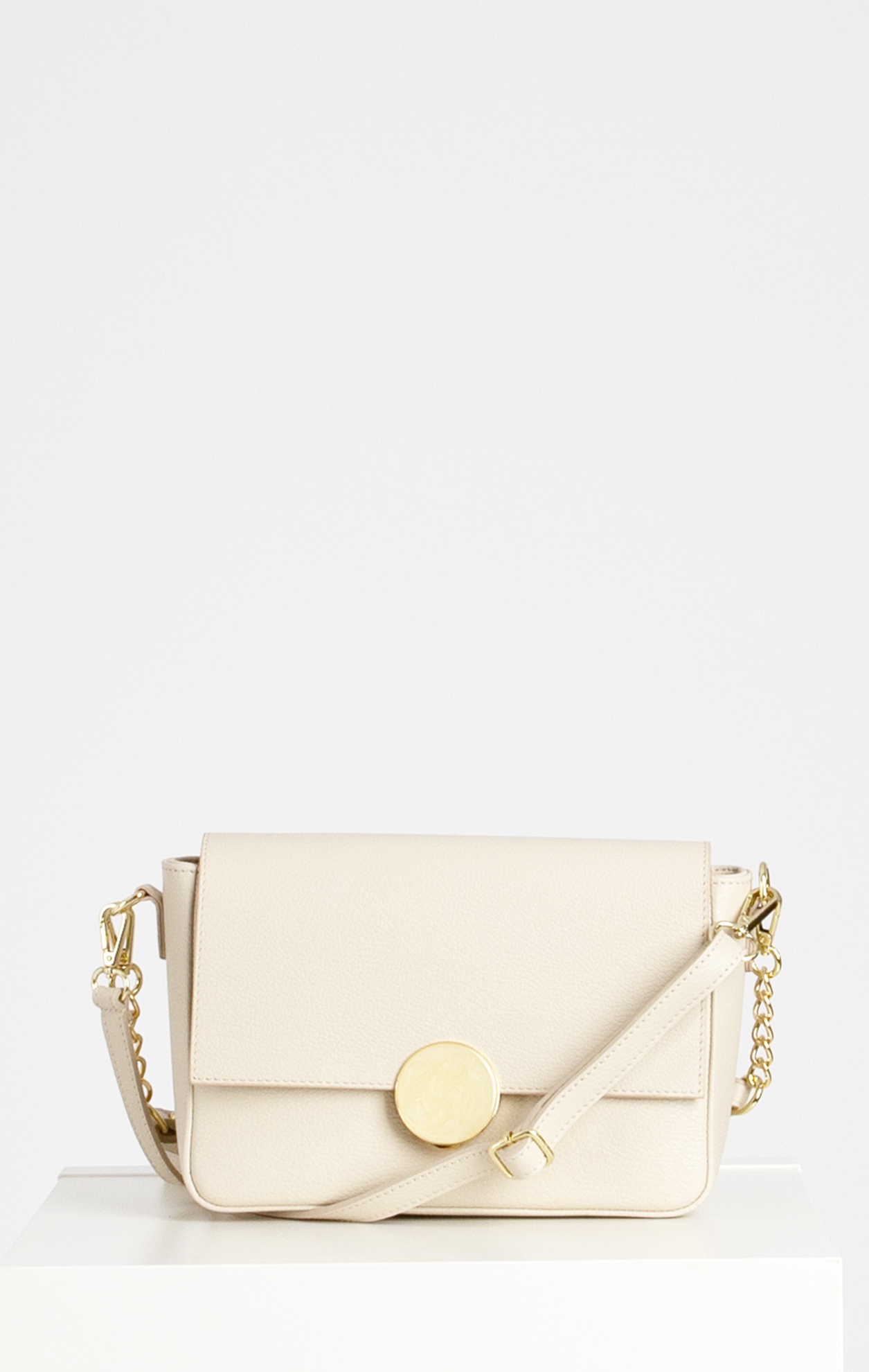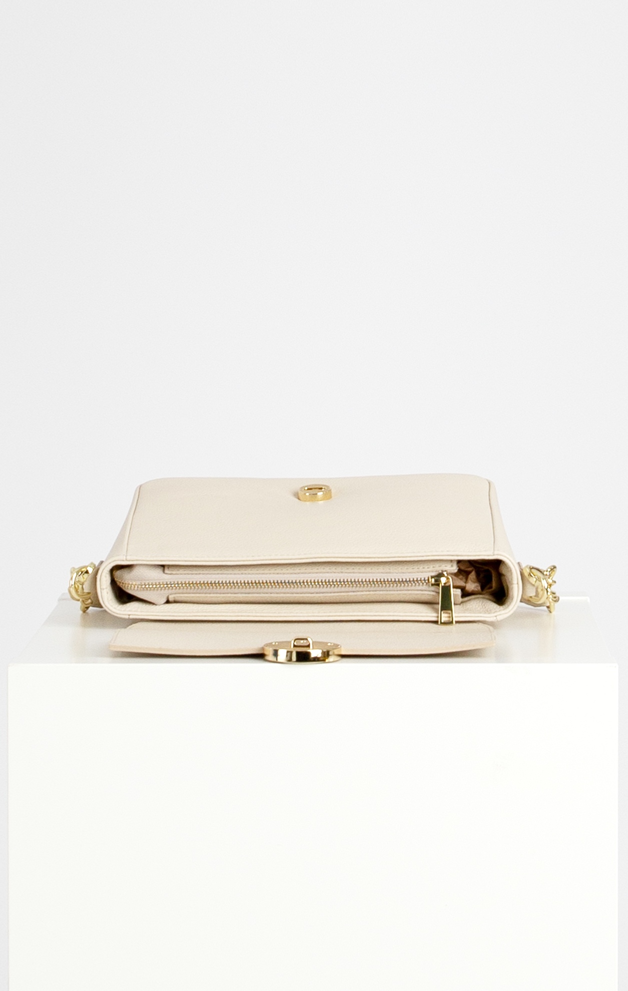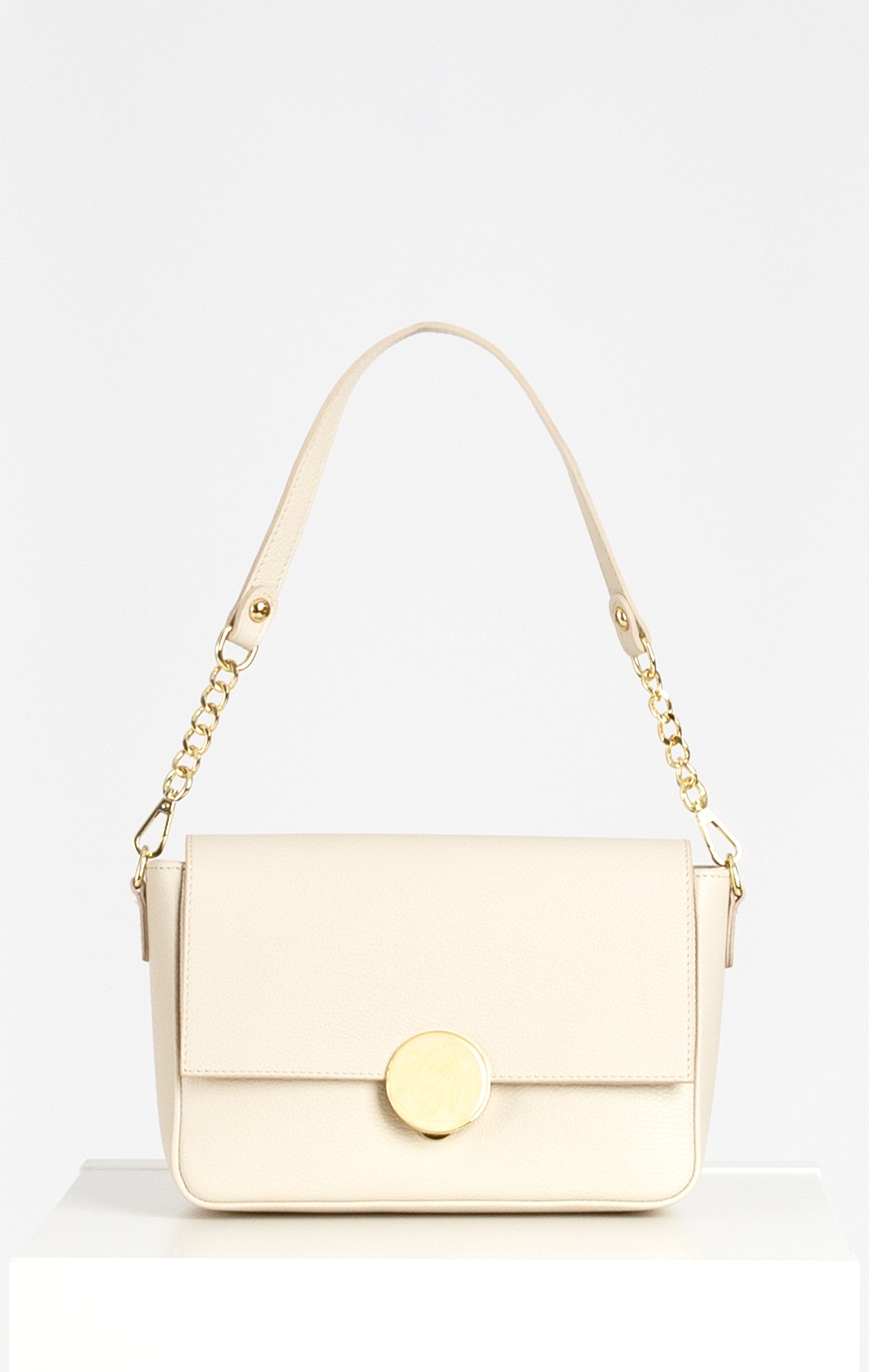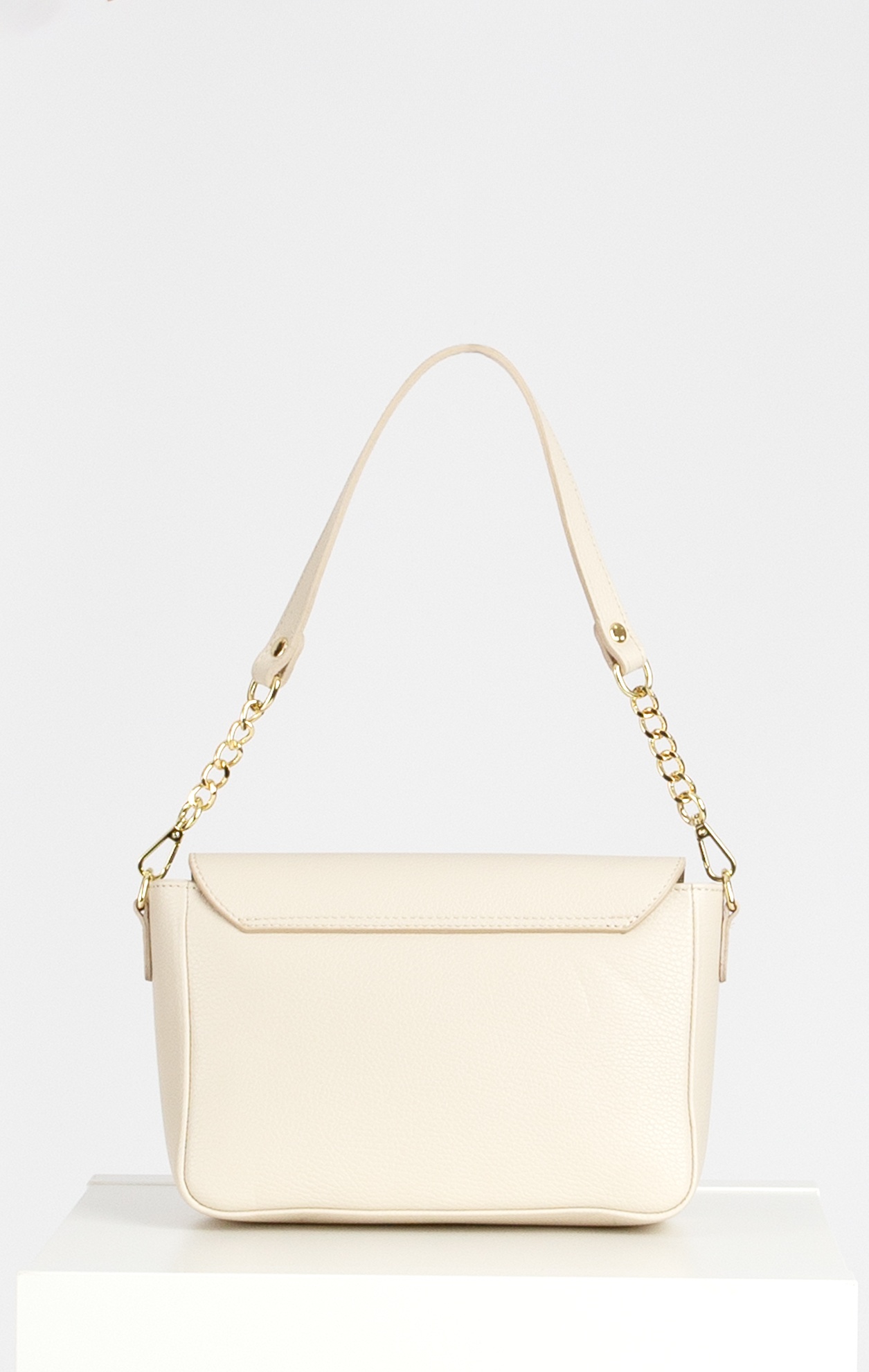 A classic leather shoulder bag with matching leather shoulder strap with a distinctive gold chain and matching stitching. The lovely gold fittings contributes to this handbag's individuality and gives it a lush and sophisticated appearance, combined with a gold zipper. Along with the luxurious Italian leather used to create this fashionable beauty, its urban, exquisite style and shape ensure that others will take notice of you. The bag can be worn on your shoulder or cross-body as needed thanks to the adjustable cross-body strap and shoulder strap. Made in Italy for Daphne. Dimensions: 28/18/8 cm.