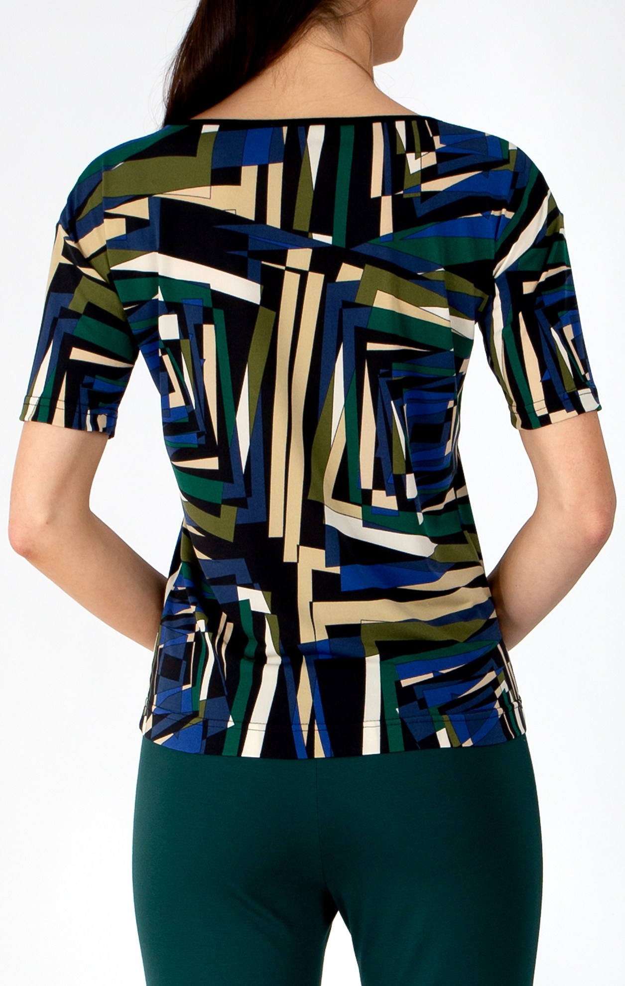 Striking blouse with a relaxed silhouette, featuring an abstract geometric print in Royal Blue, Green Olive, and Ecru. The model has a loose fit, short sleeves with dropped shoulders, and a boat neckline that delicately highlights the neck and shoulders. A comfortable blouse made from stretchy jersey knit, perfect for everyday wear and the office.
