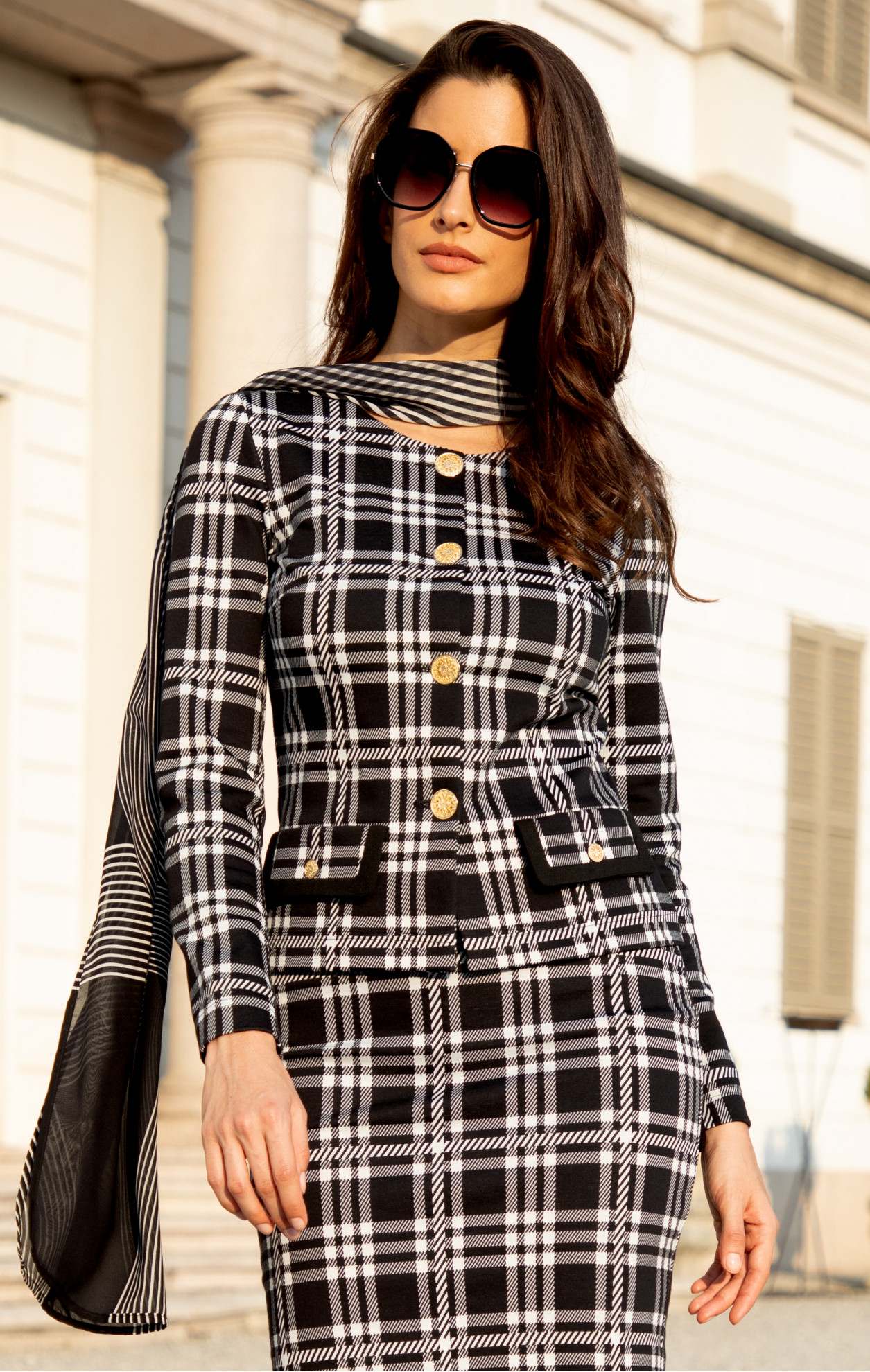The blazer has a fitted silhouette, long sleeves, and a round neckline, without lining for added comfort and easy care. Made from stretchy knitted jacquard, it features golden buttons for a stylish accent and decorative flaps. Perfect for both the office and elegant everyday looks. Pair it with a skirt or dress in the same pattern.