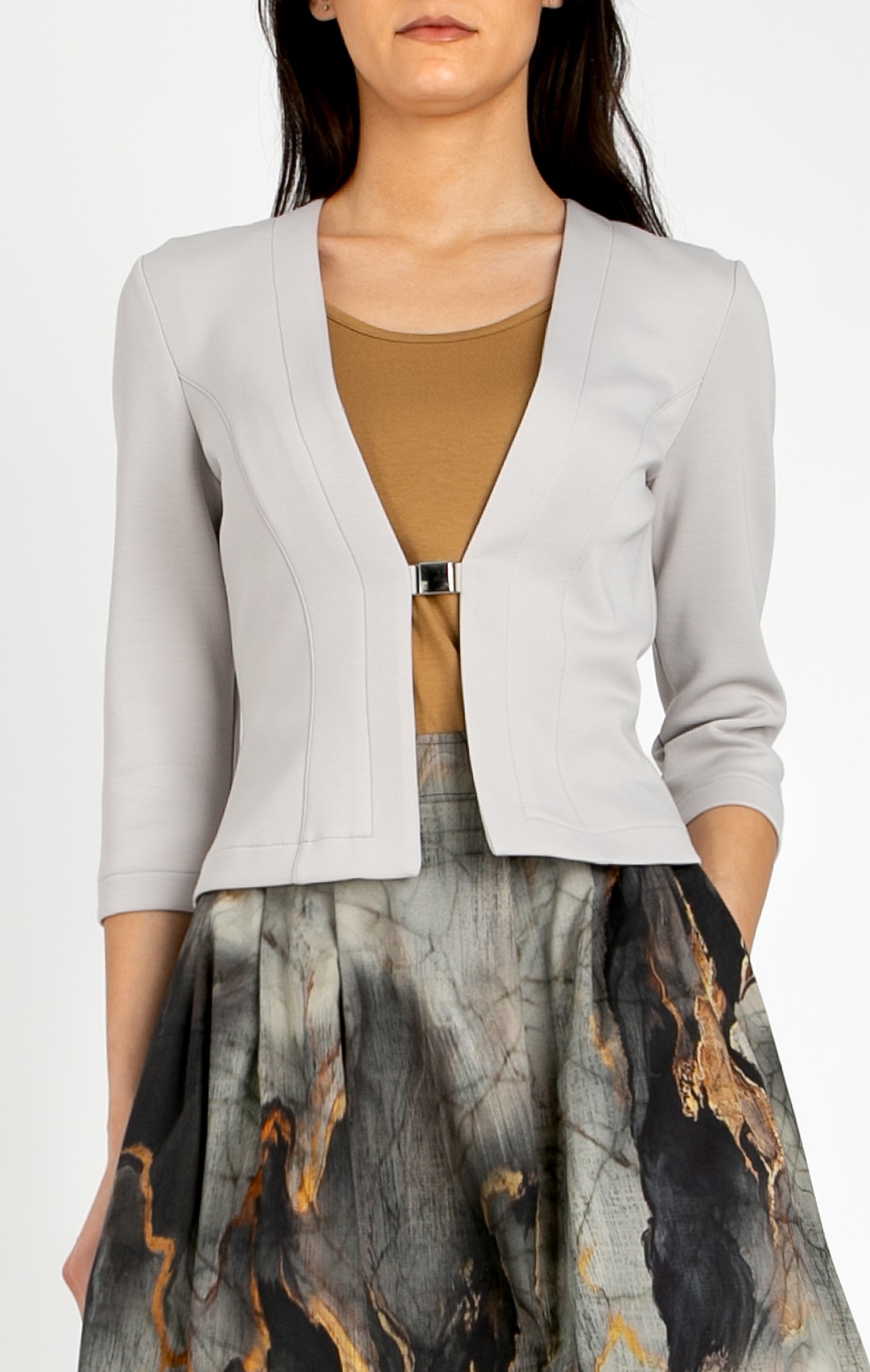 Stylish blazer crafted from high-quality structured knit fabric in an elegant pearl grey shade. The model features 3/4 sleeves and a refined metal fastening, giving it a modern and polished look. This blazer is the perfect addition to a contemporary wardrobe, combining the comfort of knitwear with classic, understated elegance. The precise tailoring enhances the silhouette while ensuring excellent shape and all-day comfort. It pairs beautifully with skirts, trousers, or formal dresses.