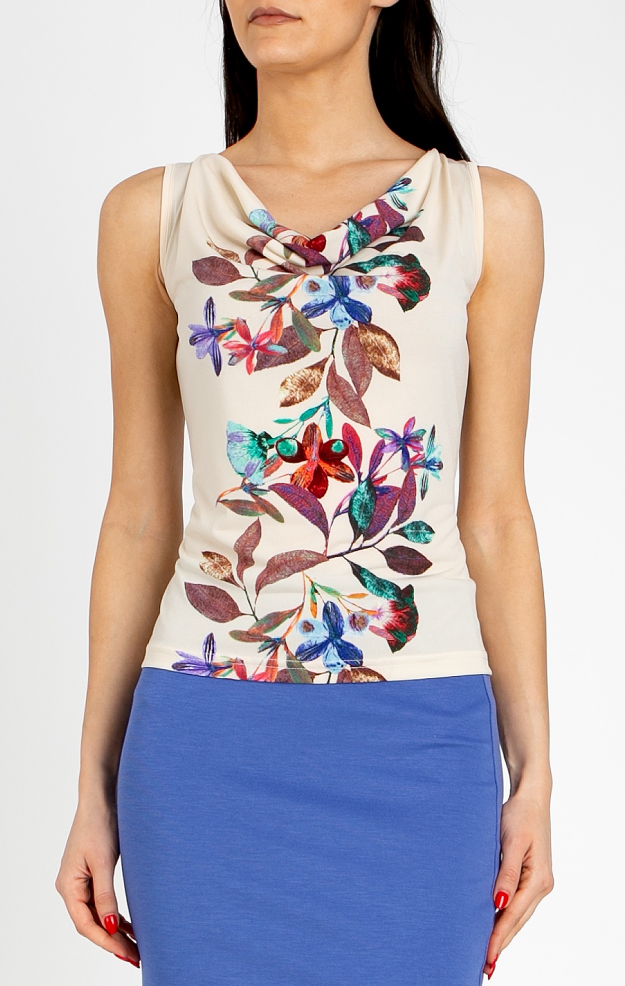 Stylish blouse with a draped neckline in Vanilla Ice, featuring a vertical floral border that visually elongates the silhouette. The model has a fitted, sleeveless design with a beautifully draped neckline that highlights the neck, made from stretchy jersey fabric. A versatile piece that pairs easily with blazers, skirts, and trousers—an ideal choice for a modern urban look.