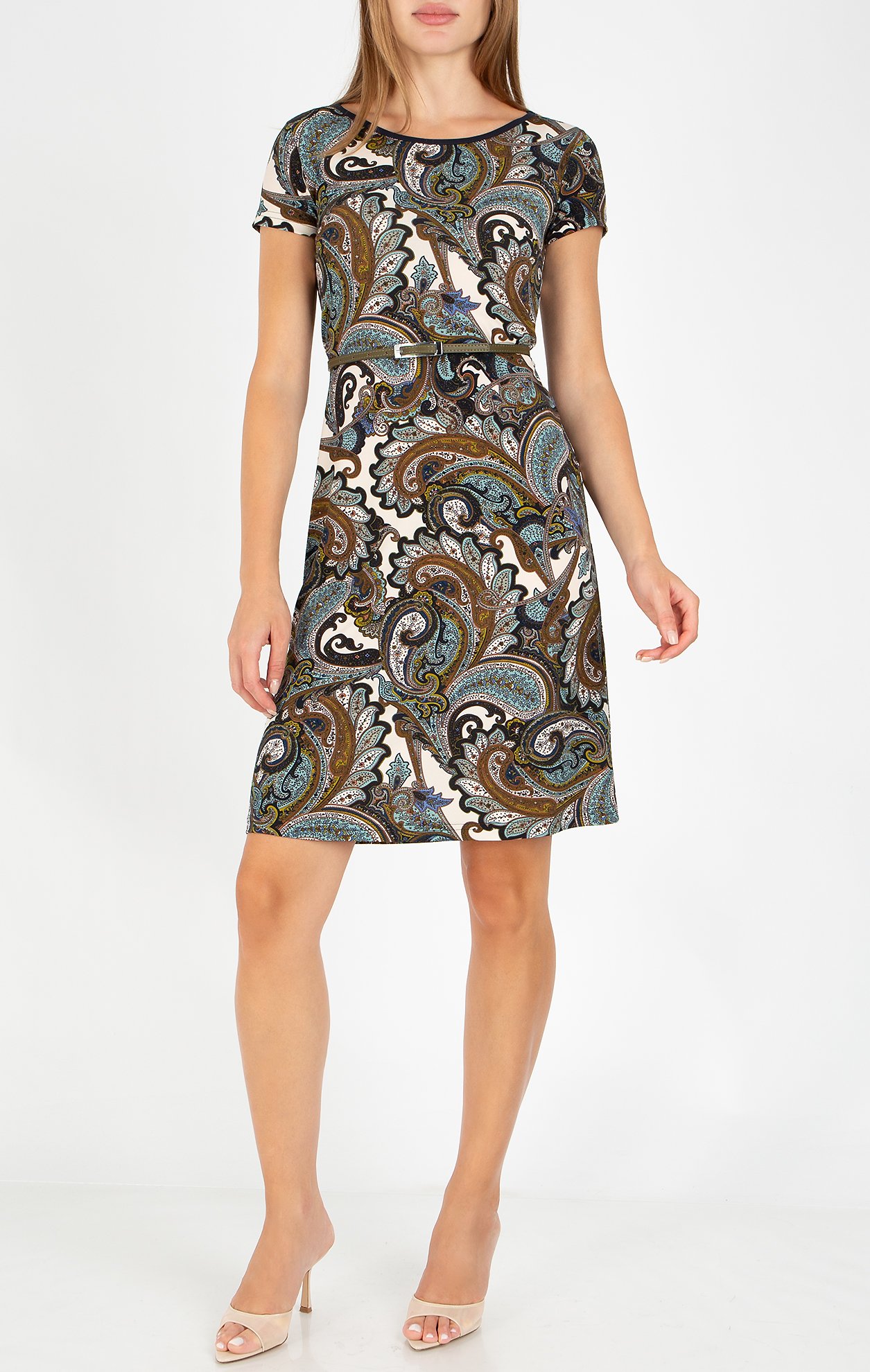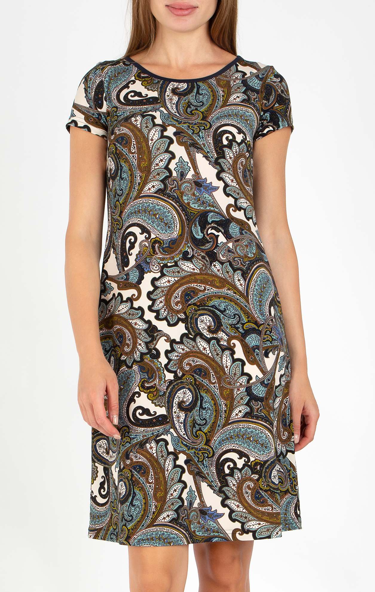 Comfortable summer dress made of lightweight jersey knit fabric with paisley motifs in earthy tones. The dress features an A-line silhouette, a round neckline finished with trim, and a teardrop opening at the back. The fabric is light and comfortable, providing a cooling effect during warm summer days.