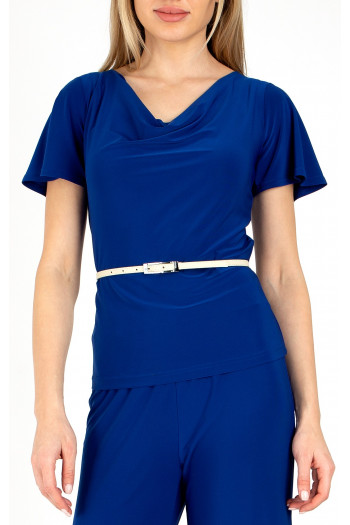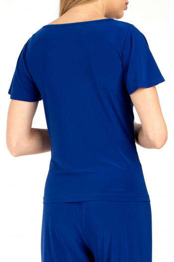 Stylish satin viscose trousers with blue floral motifs. The model is in a loose silhouette with an elasticated waistband, which makes it extremely comfortable and lightweight to wear on hot summer days. Feel stylish and comfortable with the Daphne trousers. Combine easily with a blouse from our new collection.