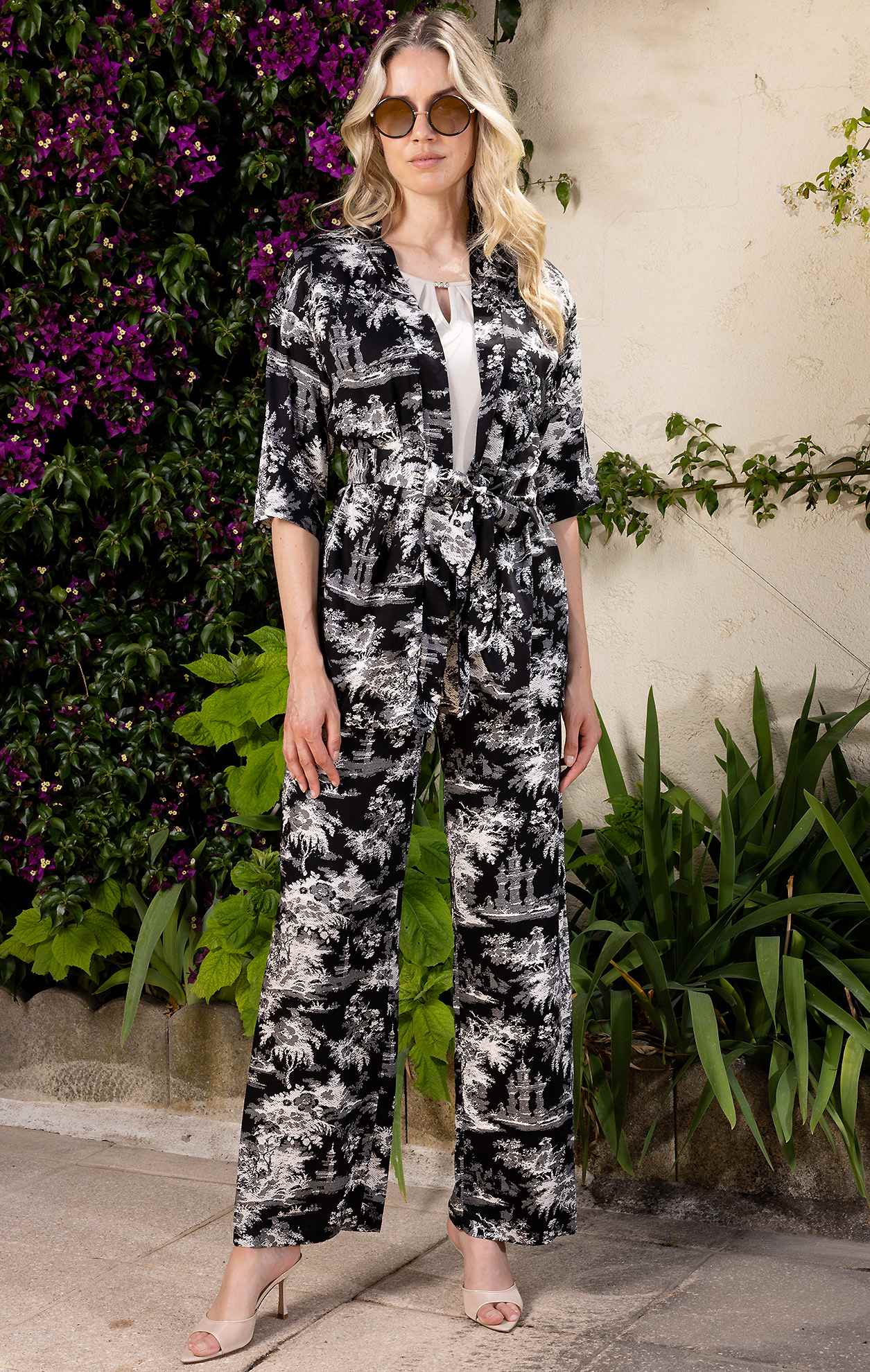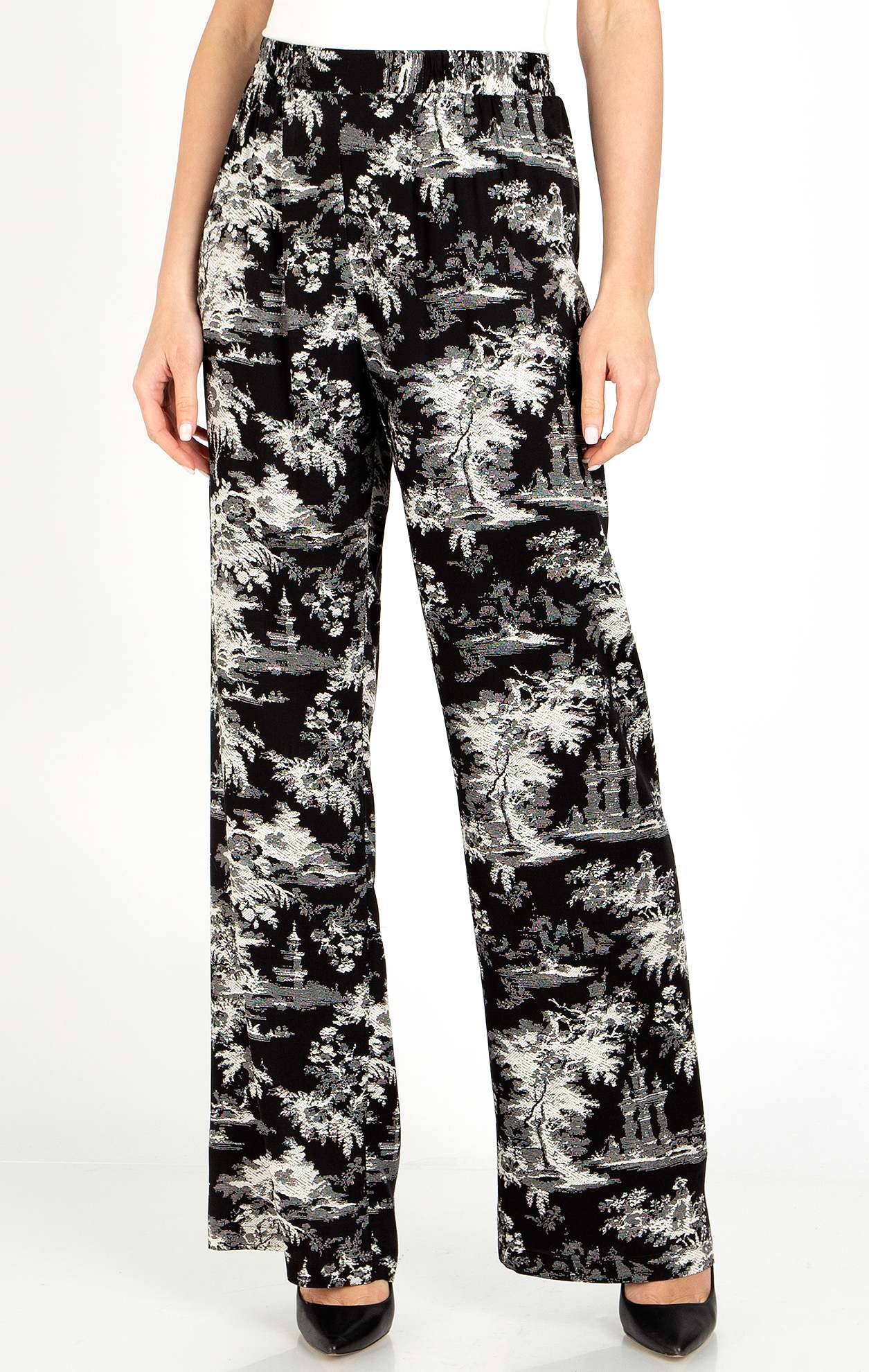 Trousers made of light viscose with black and white print. Crafted from satin viscose in a relaxed silhouette with an elastic waistband for maximum comfort. Feel stylish and at ease with Daphne trousers. Easily matches blouses from our new collection. Available in sizes 36 to 46.