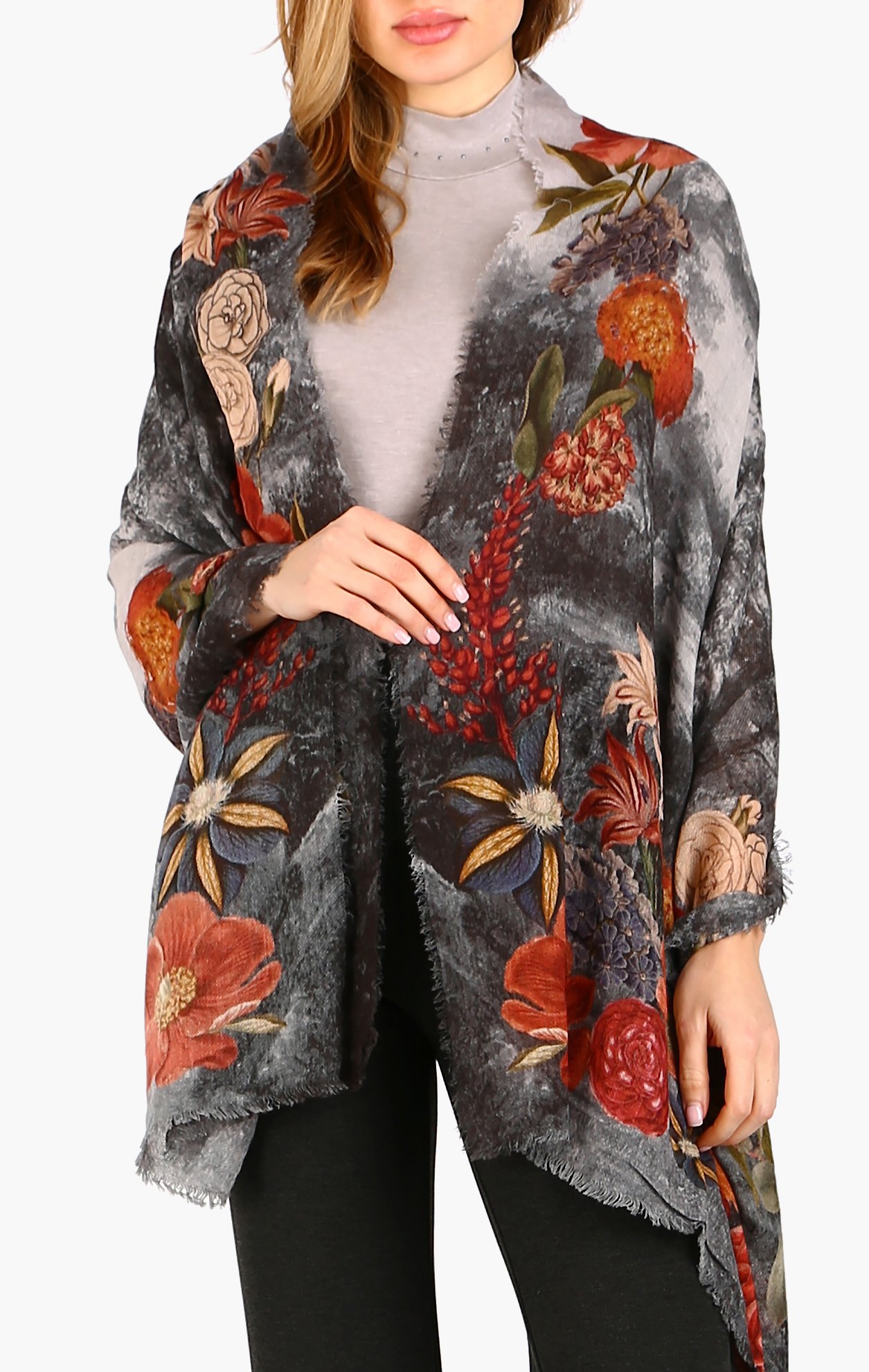 A warm wool and modal scarf with orchid patterns in red tones