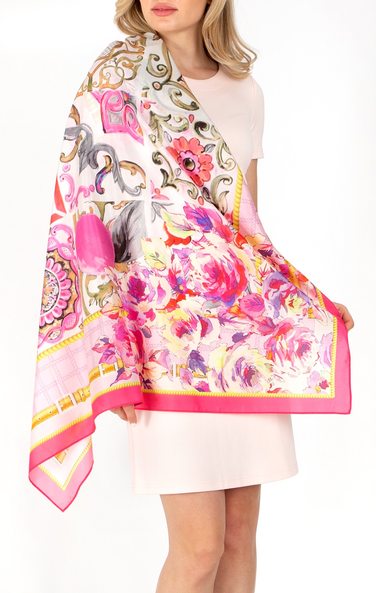 Stunning 100% silk scarf. The predominantly delicate pink colours are a symbol of femininity and encourage romance. The silk contributes to creating a fairytale feeling in every daily routine.